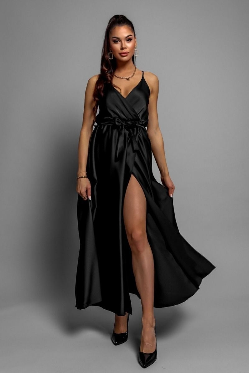 Black Satin Wrapover Strappy Belted Maxi Dress