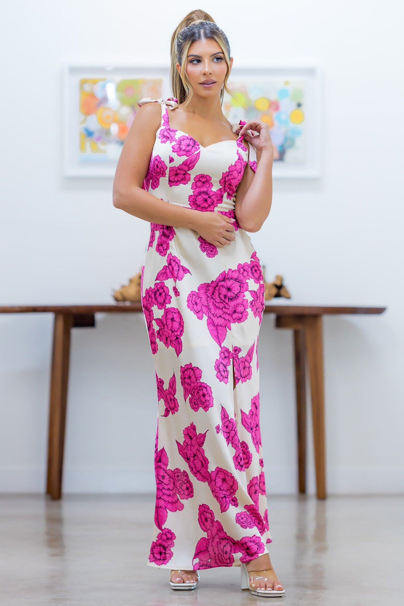 Slay effortlessly in our Satin Floral Maxi Dress. Its cinched waist and adjustable strap add the perfect amount of flair to this fit and flare dress. With a sweet pattern and slits to show off those stems, this dress is perfect for any occasion.