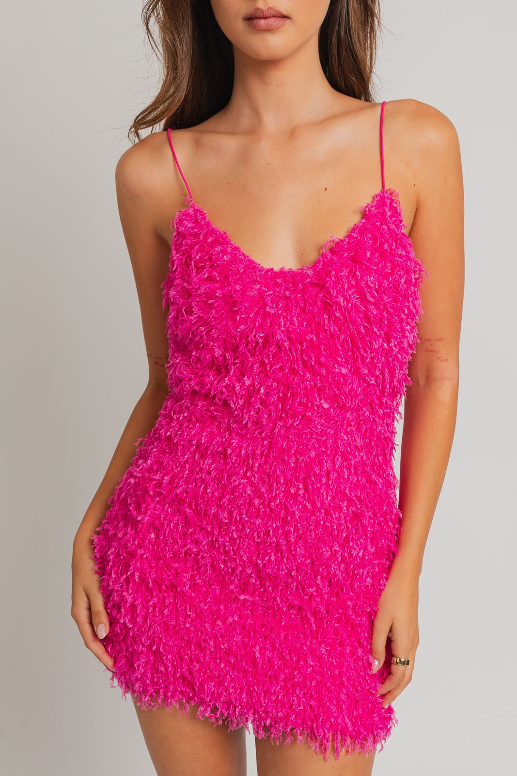 Make a statement in our Layla Pink fur Mini dress! With a unique pink fringe fabric and playful spaghetti straps, this mini dress will add a touch of fun to any outfit. Perfect for a night out or a special occasion, you'll be sure to turn heads and have a great time!