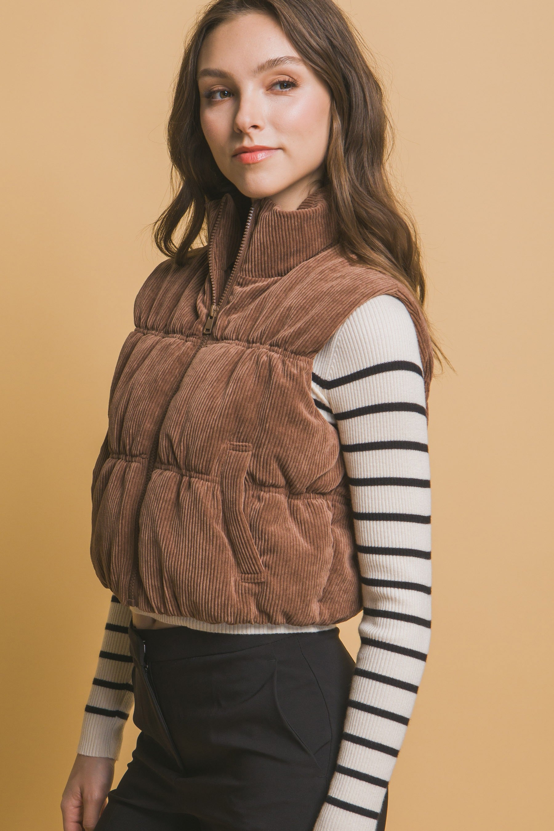 Unleash your adventurous spirit with our Corduroy Zip Up Puffer Vest! Featuring a sleek zip closure and two convenient pockets, this vest is made from durable corduroy material for added warmth and style. Perfect for any daring outdoor excursion or casual everyday wear.