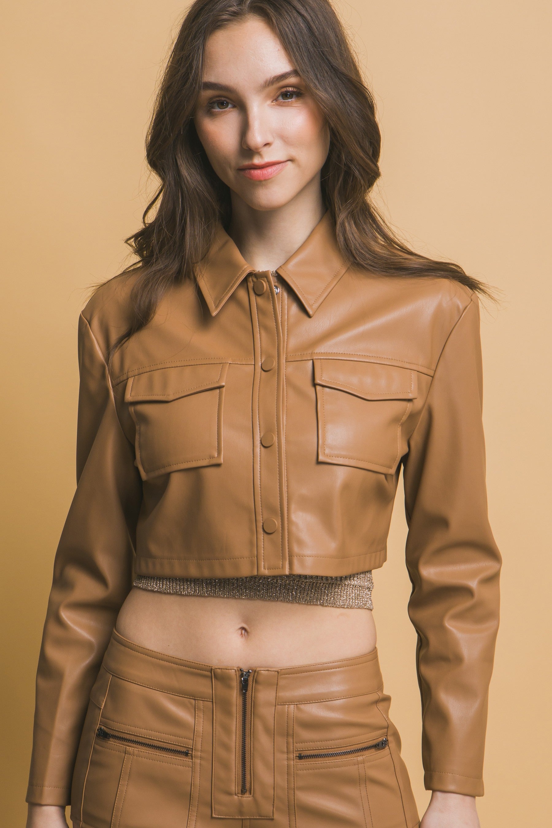 Elevate your wardrobe with the Valeria Leather Crop top Jacket. Made from PU leather, this cropped jacket is perfect for adding a touch of edginess to any outfit. Whether you're going for a bold look or just need an extra layer of warmth, this jacket has you covered (both literally and figuratively)!